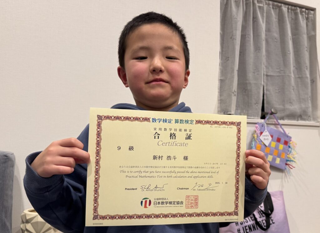 この度、算数検定9級(小学3年生レベル)に合格された小学2年生の浩斗さん。