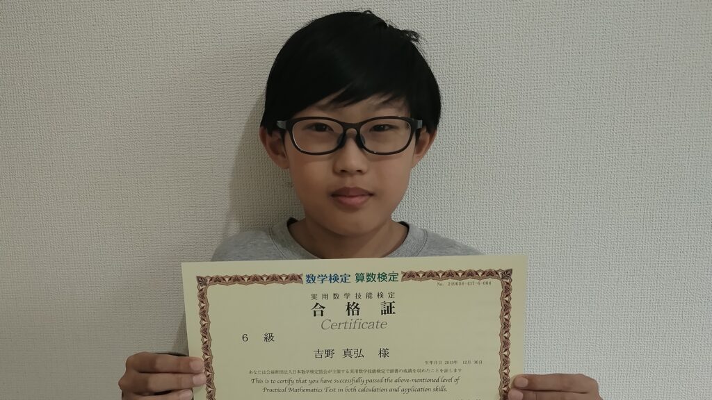 小学5年生で、算数検定6級(小学6年生相当)に合格しました。