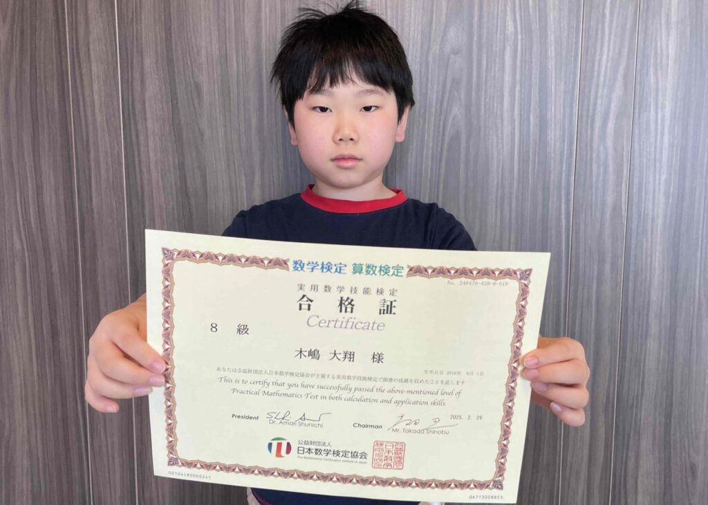 この度、算数検定8級(小学4年生レベル)に合格された