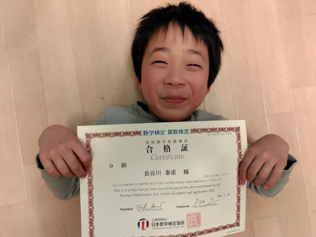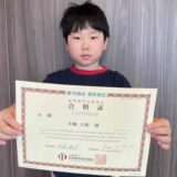 この度、算数検定9級(小学3年生レベル)に合格された小学2年生の泰甫さん。