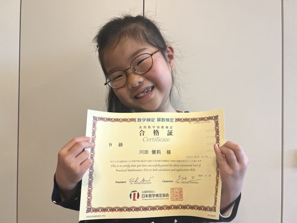現在、公立小学校2年生の女の子です。2024年11月実施の算数検定9級に合格いたしました。
