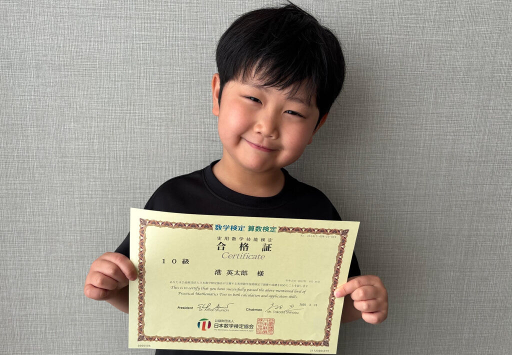 この度、算数検定10級(小学2年生レベル)に合格された小学1年生の英太郎さん。