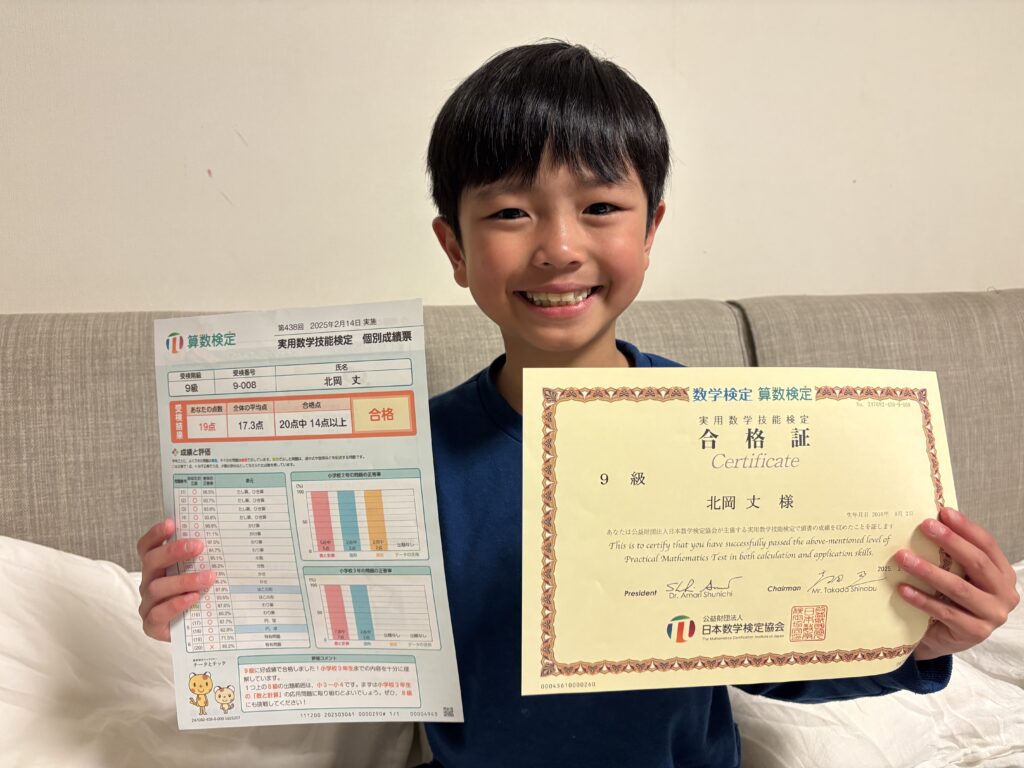 この度、算数検定9級(小学3年生レベル)に合格された小学2年生の丈さん。