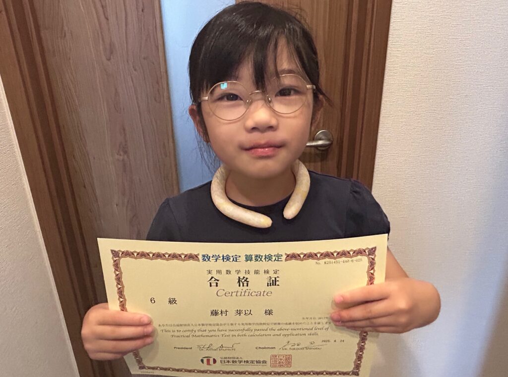 この度、算数検定6級(小学6年生レベル)に合格された小学3年生の芽以さん。