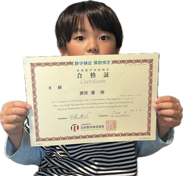 この度、算数検定8級(小学4年生レベル)に合格された小学3年生の蓮さん。