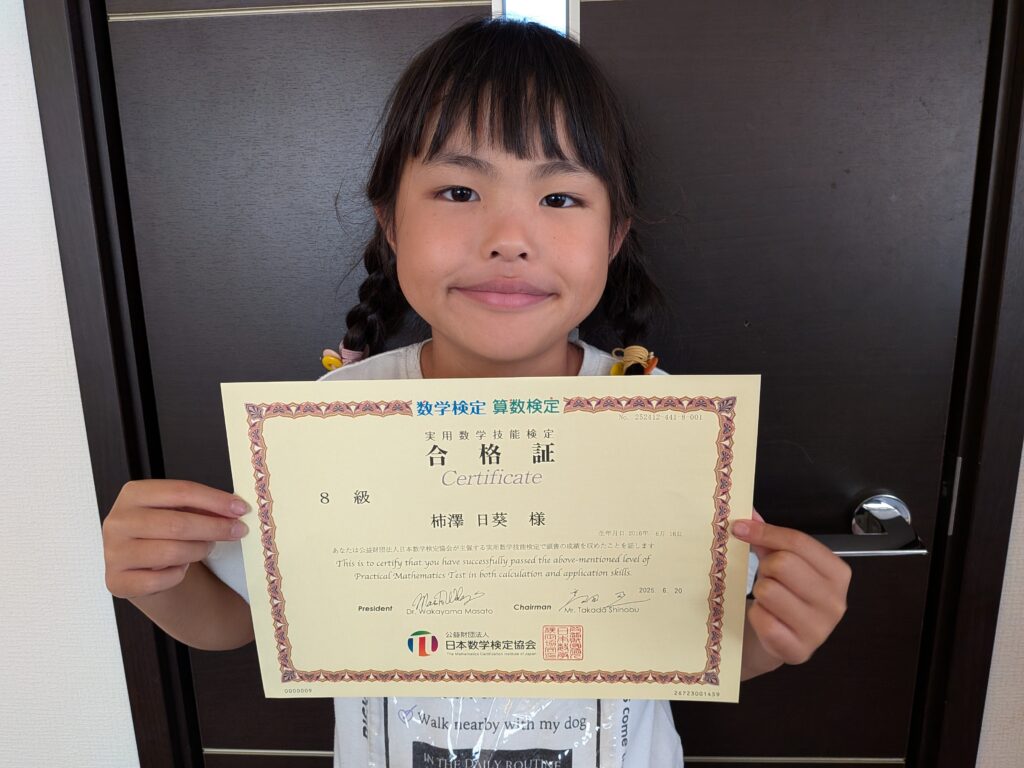 この度、算数検定8級(小学4年生レベル)に合格された小学3年生の日葵 さん。