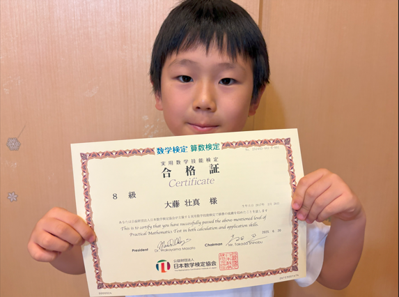 この度、算数検定8級(小学4年生レベル)に合格された小学3年生の壮真さん。