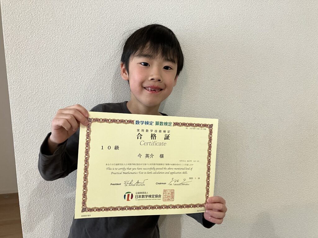 この度、算数検定10・9級(小学2年生・3年生レベル)に合格された小学1年生の英介さん。