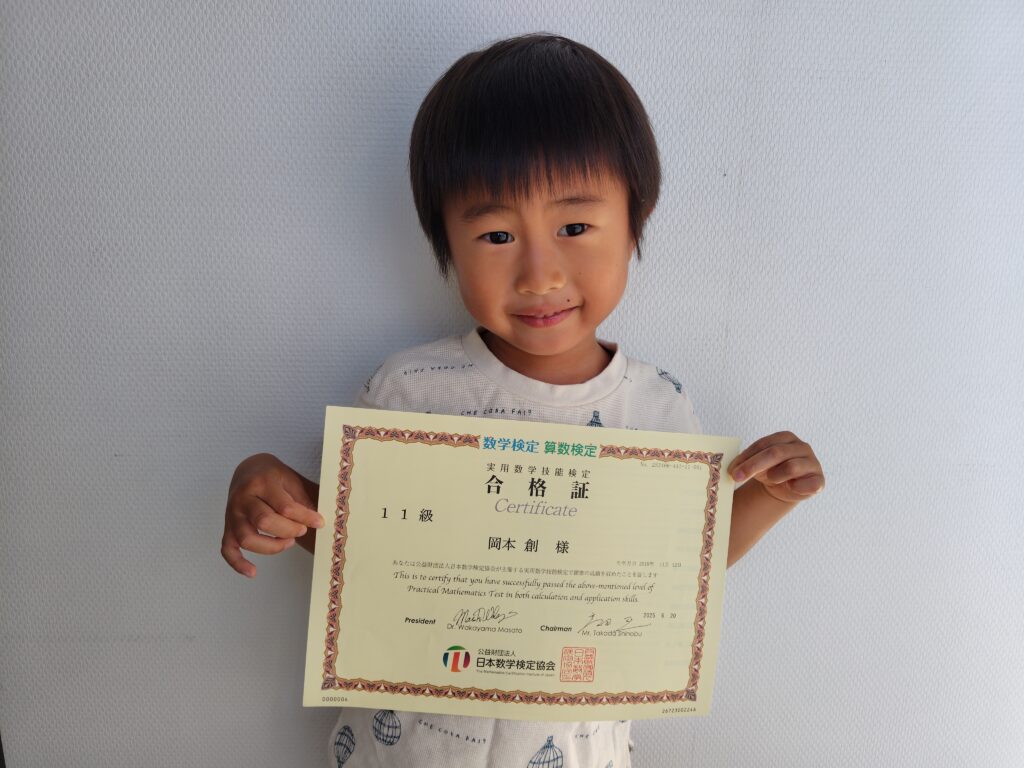 この度、算数検定11級(小学1年生レベル)に合格された年長の創さん。