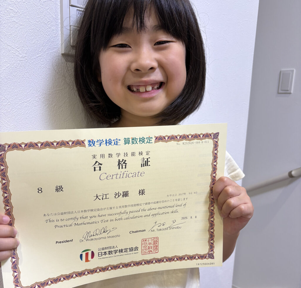 そのおかげもあり、算数検定8級に一回で合格することができました。