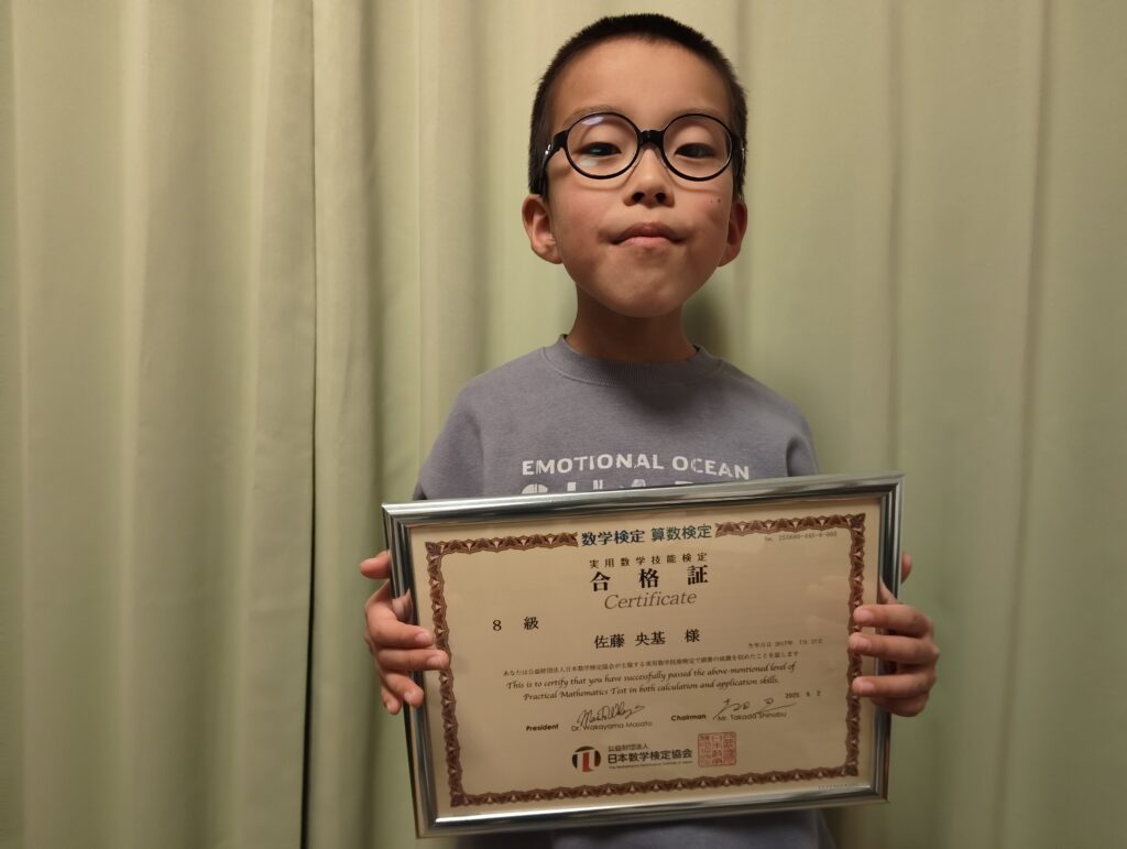 この度、算数検定8級(小学4年生レベル)に合格された小学2年生の央基さん。