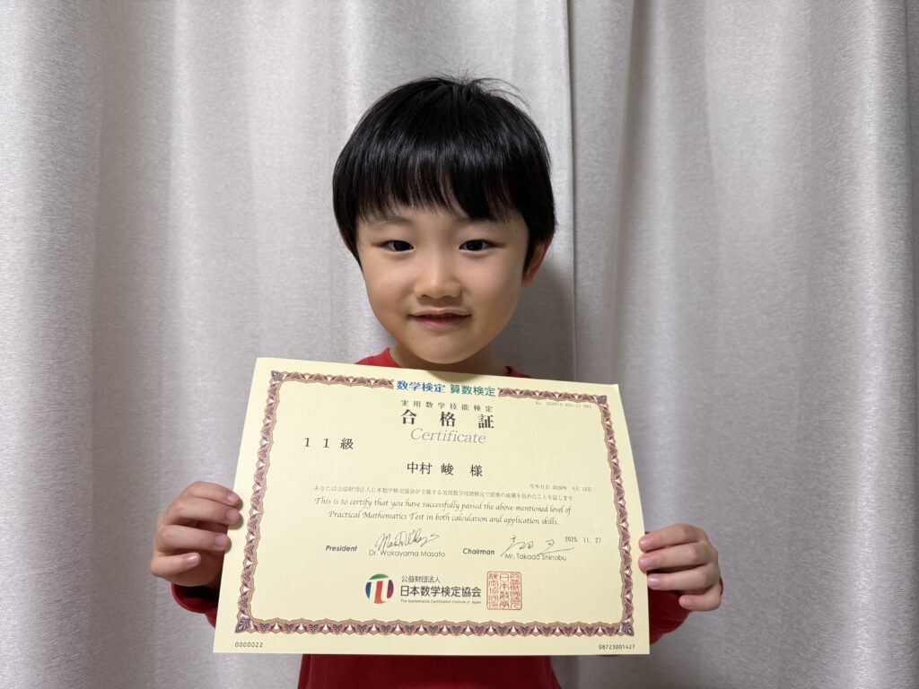 この度、算数検定11級(小学1年生レベル)に合格された年中の峻さん。