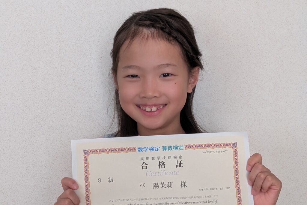 この度、算数検定8級(小学4年生レベル)に合格された小学3年生の陽茉莉さん。